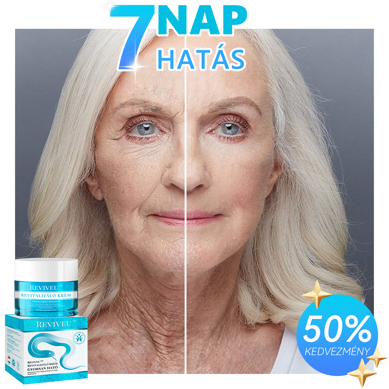 Válassza a Reviveu™ Revitalizáló Krémet, és engedje meg, hogy a kígyóméreg peptid ereje csodát tegyen a bőrével – mindössze 7 nap alatt! Ez a különleges, intenzív anti-aging kezelés gyorsan, de kíméletesen regenerálja és nyugtatja bőrét, visszaadva annak fiatalos, sima megjelenését. A Reviveu™ segít eltüntetni a finom vonalakat, feszesíti a bőrt, és hatékonyan kezeli a pigmentfoltokat, pattanásokat és ekcémát is. Ne hagyja ki ezt az egyedülálló lehetőséget – egy hét múlva bőre frissebb, ragyogóbb és magabiztosabb lesz, mint valaha! Vásároljon most, és élvezze a valódi változást!